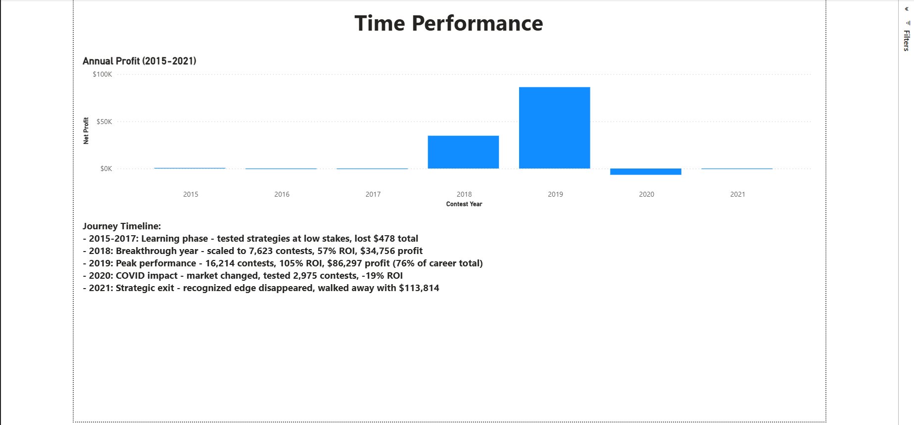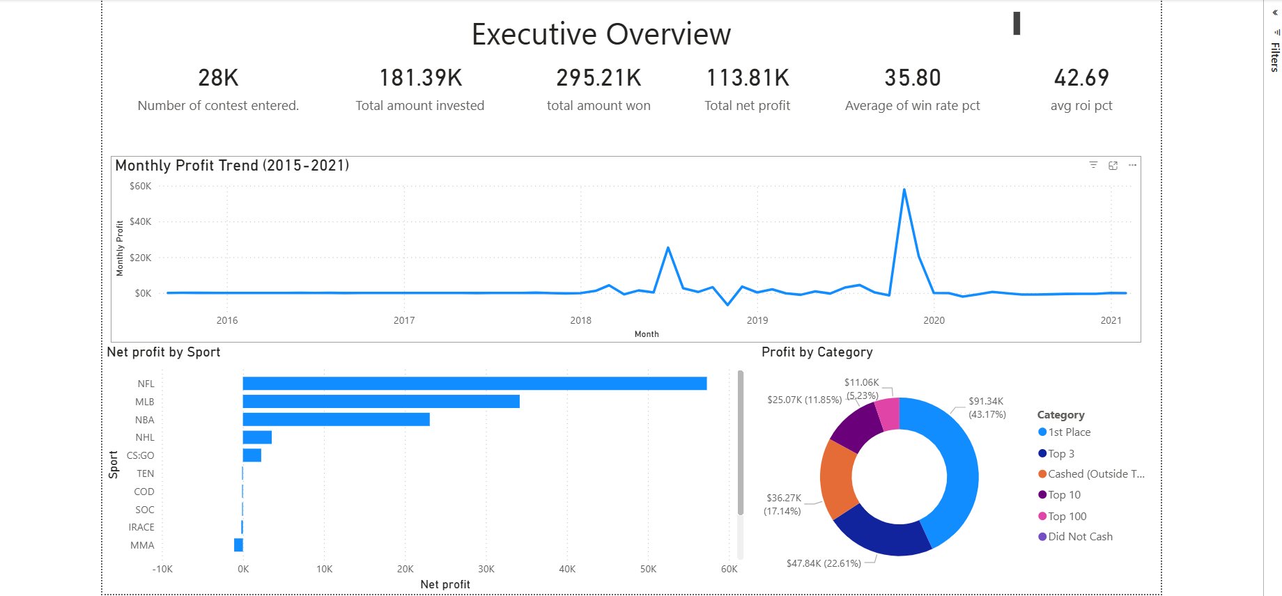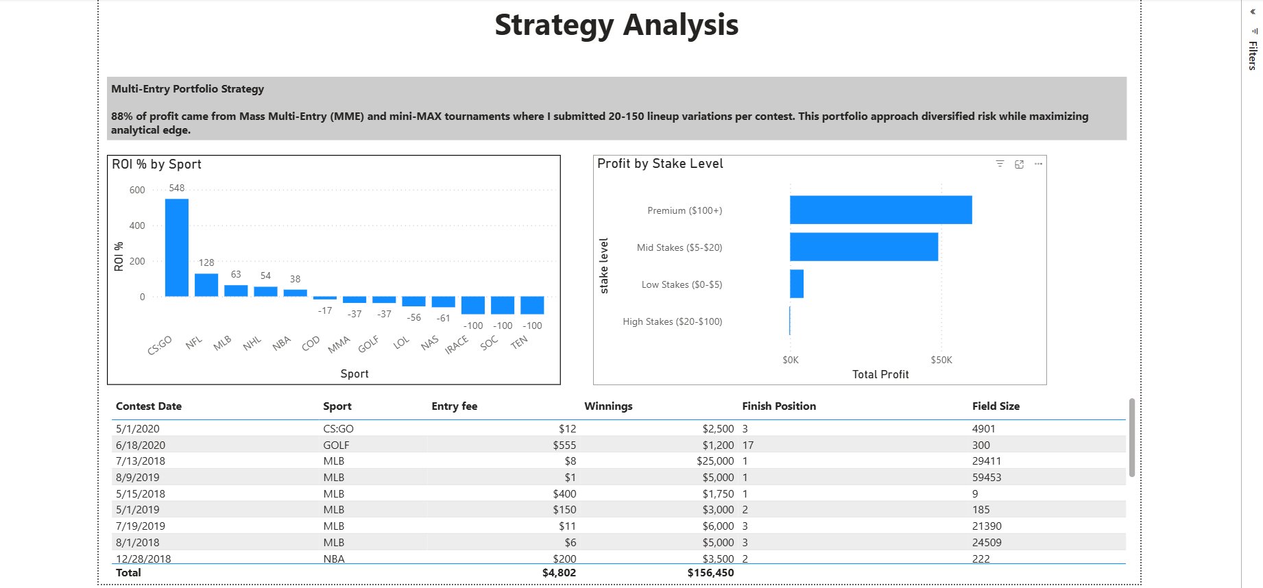 Built a 3-page Power BI report analyzing 28,000+ contest entries across 10 sports. Visualized $113,814 net profit through KPI dashboards, sport-level ROI analysis, stake-level profitability segmentation, and a 7-year time performance narrative. Multi-entry portfolio strategy delivered a 42.69% average ROI.